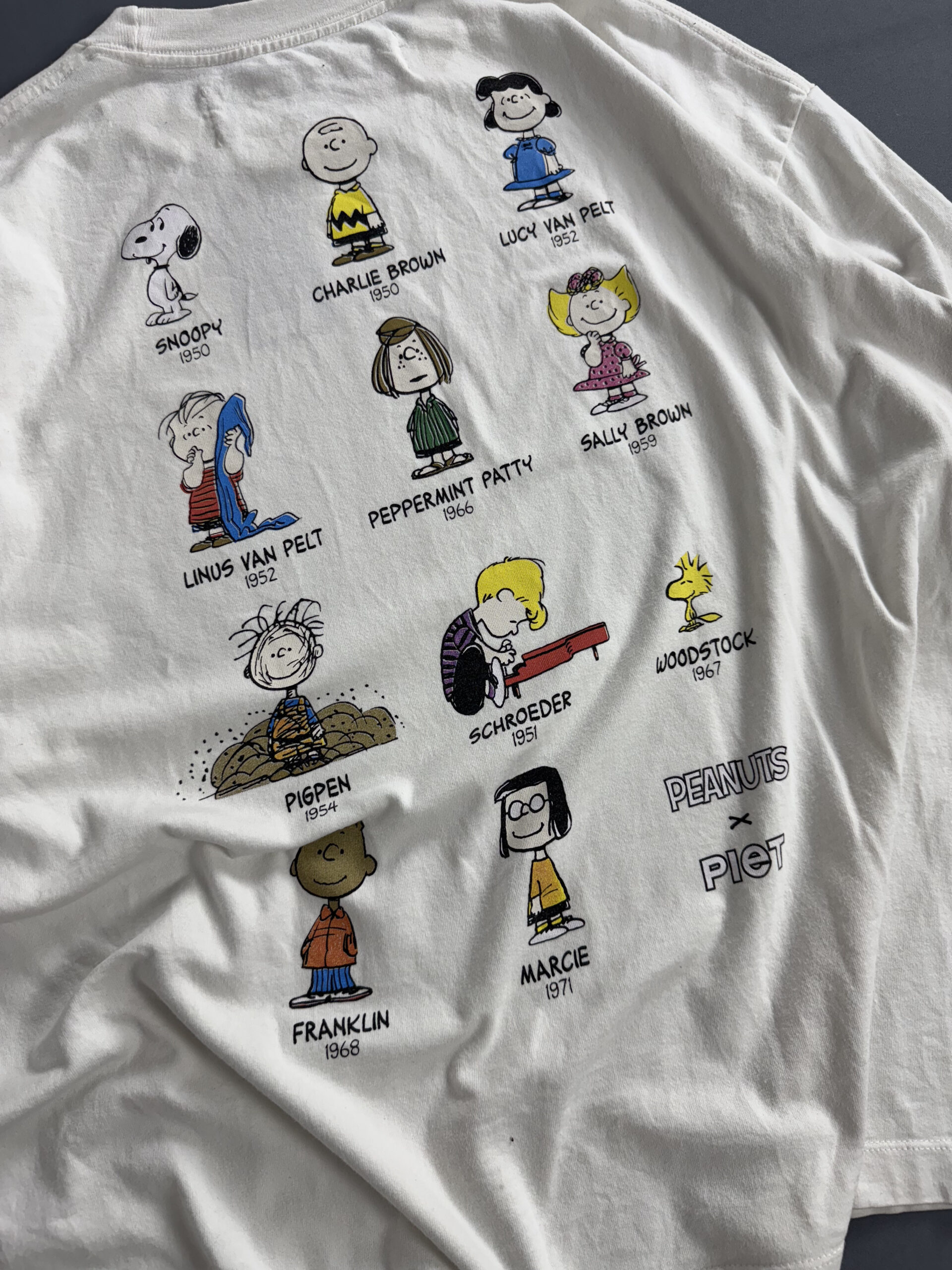 Peanuts Crew tem modelagem oversized, com mangas mais amplas e gola de 3 cm. Possui estampa em silk com todos os personagens de Peanuts nas costas e o escrito Piet na parte frontal.