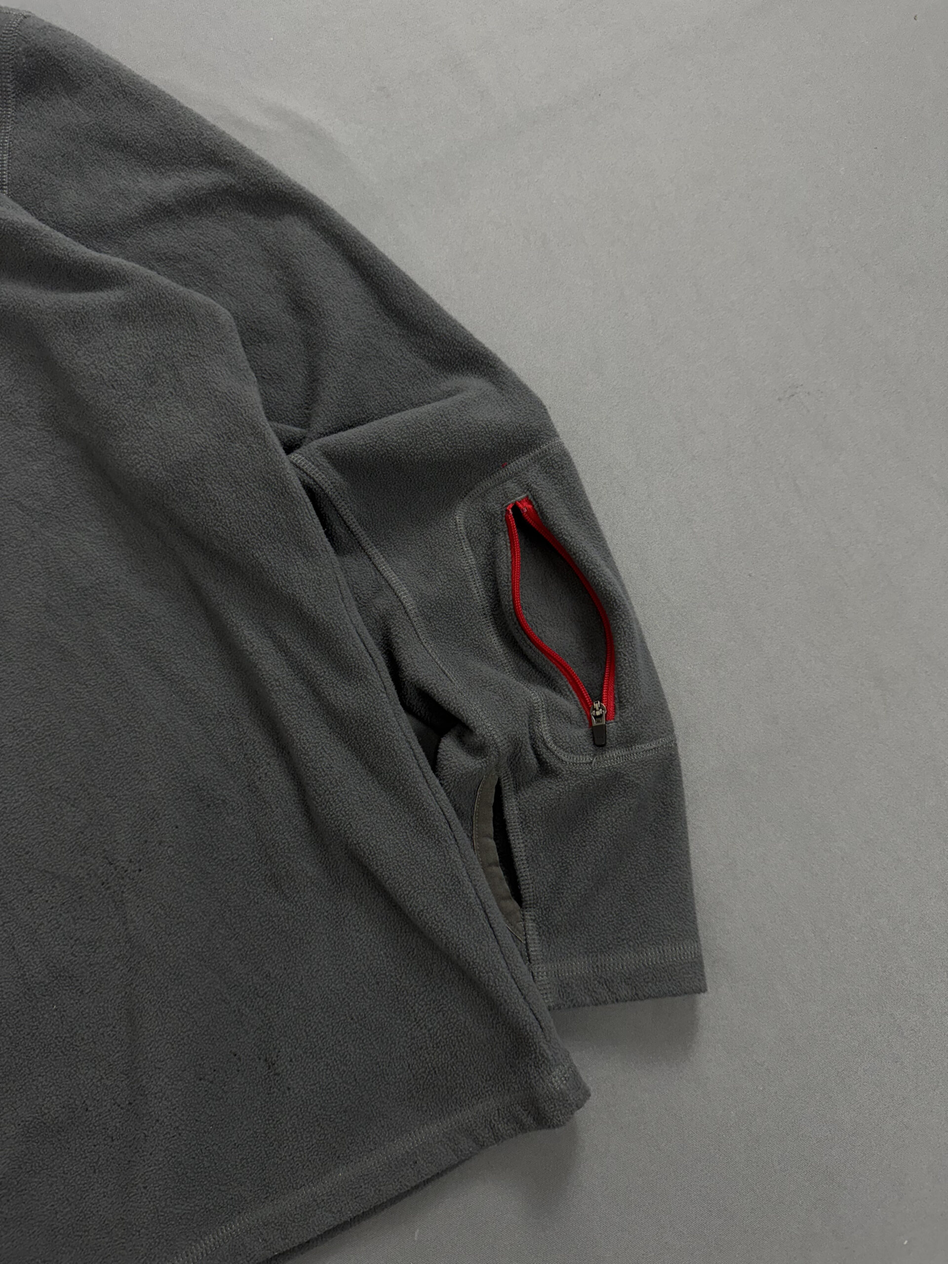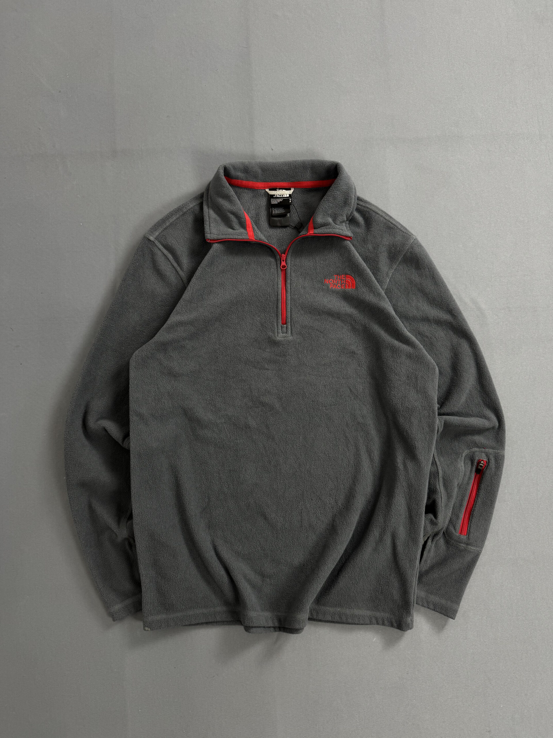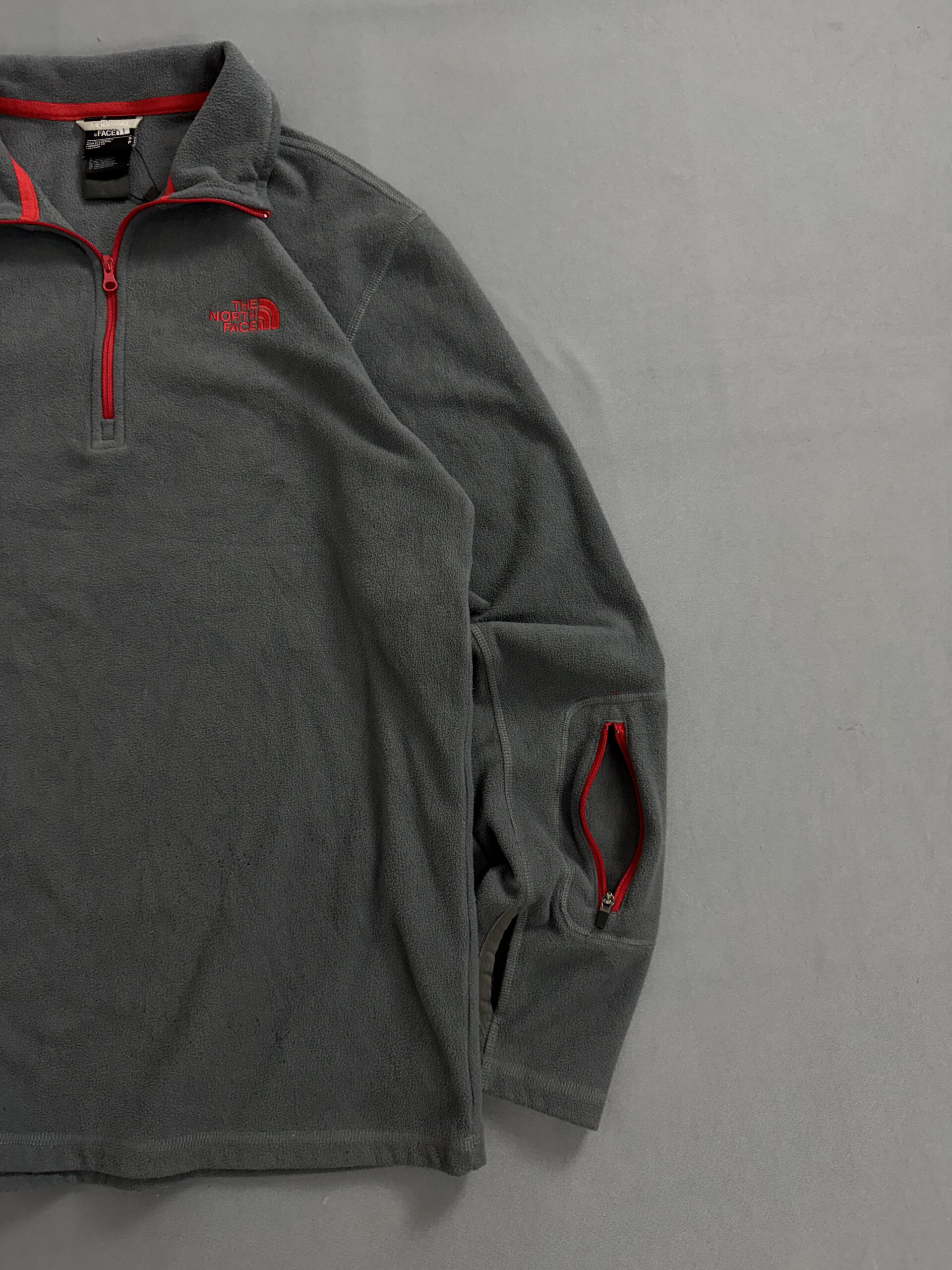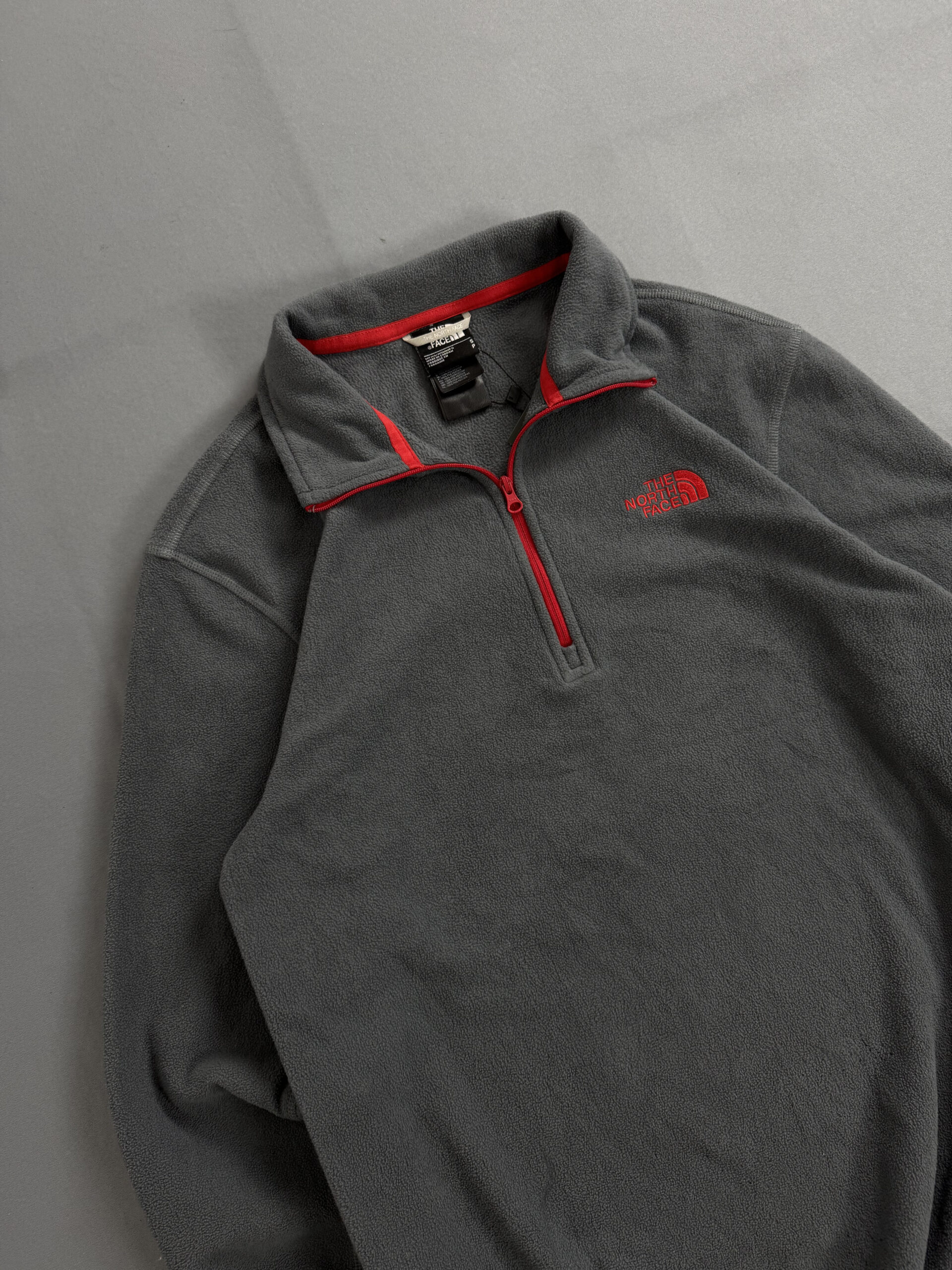 Fleece The North Face em tom cinza com zíper e logo em destaque na cor vermelha. Modelo half zip, ideal para aquecer com estilo em dias frios. Confeccionado com tecido leve e confortável, combina proteção contra vento com um visual moderno e esportivo. Perfeito para aventuras ao ar livre ou uso casual.